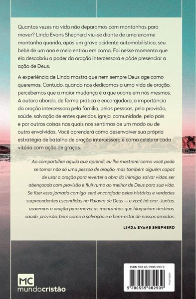 Quantas vezes na vida não deparamos com montanhas para mover? Linda Evans Shepherd viu-se diante de uma enorme montanha quando, após um grave acidente automobilístico, seu bebê de um ano e meio entrou em coma. Foi nesse momento que ela descobriu o poder da oração intercessora e pôde presenciar a ação de Deus. A experiência de Linda mostra que nem sempre Deus age como queremos. Contudo, quando nos dedicamos a uma vida de oração, percebemos que a maior mudança é a que ocorre em nós mesmos. A autora aborda, de forma prática e encorajadora, a importância da oração intercessora pela família, pelas pessoas, pela provisão, saúde, salvação de entes queridos, igreja, comunidade, pelo país e por outras coisas nas que nos sentimos de um modo ou de outro envolvidos. Você aprenderá como desenvolver sua própria estratégia de batalha de oração intercessora e como celebrar cada vitória com ação de graças. Ao compartilhar aquilo que aprendi, eu lhe mostrarei como você pode se tornar não só uma pessoa de oração, mas também alguém capaz de usar a oração para reverter a obra do inimigo, salvar vidas, ser abençoada com provisão e fluir rumo ao melhor de Deus para sua vida. Se fizer essa jornada comigo, será encorajada pelas histórias e verdades surpreendentes escondidas na Palavra de Deus - e você irá orar. Juntas, usaremos a oração para mover as montanhas que bloqueiam destinos, saúde, provisão, bem como a salvação e o bem-estar de nossos amados. Linda Evans Shepherd
