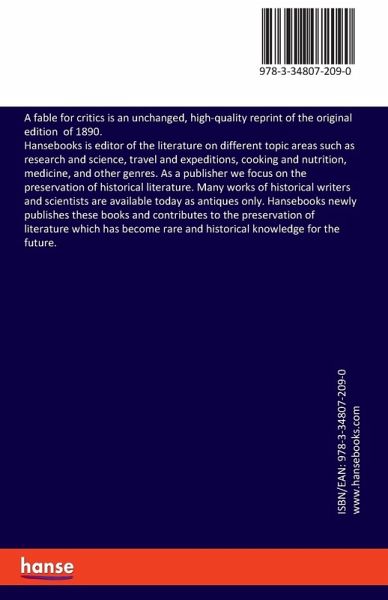 A fable for critics is an unchanged, high-quality reprint of the original edition of 1890.Hansebooks is editor of the literature on different topic areas such as research and science, travel and expeditions, cooking and nutrition, medicine, and other genres. As a publisher we focus on the preservation of historical literature. Many works of historical writers and scientists are available today as antiques only. Hansebooks newly publishes these books and contributes to the preservation of literature which has become rare and historical knowledge for the future.