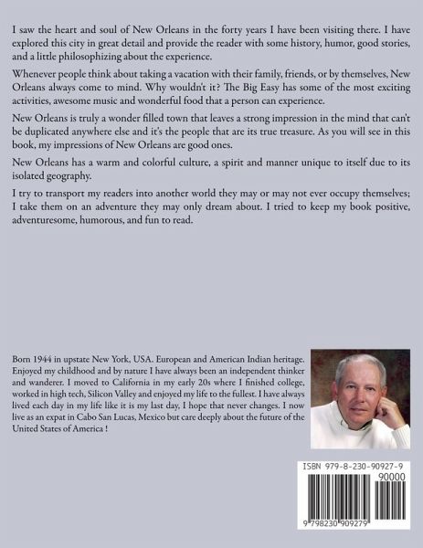 I saw the heart and soul of New Orleans in the forty years I have been visiting there. I have explored this city in great detail and provide the reader with some history, humor, good stories, and a little philosophizing about the experience. Whenever people think about taking a vacation with their family, friends, or by themselves, New Orleans always come to mind. Why wouldn't it? The Big Easy has some of the most exciting activities, awesome music and wonderful food that a person can experience. New Orleans is truly a wonder filled town that leaves a strong impression in the mind that can't be duplicated anywhere else and it's the people that are its true treasure. As you will see in this book, my impressions of New Orleans are good ones. New Orleans has a warm and colorful culture, a spirit and manner unique to itself due to its isolated geography. I try to transport my readers into another world they may or may not ever occupy themselves; I take them on an adventure they may only dream about. I tried to keep my book positive, adventuresome, humorous, and fun to read.