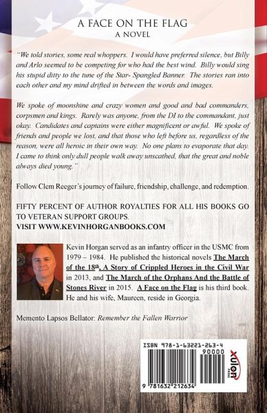 "We told stories, some real whoppers. I would have preferred silence, but Billy and Arlo seemed to be competing for who had the best wind. Billy would sing his stupid ditty to the tune of the Star- Spangled Banner. The stories ran into each other and my mind drifted in between the words and images. We spoke of moonshine and crazy women and good and bad commanders, corpsmen and kings. Rarely was anyone, from the DI to the commandant, just okay. Candidates and captains were either magnificent or awful. We spoke of friends and people we lost, and that those who left before us, regardless of the reason, were all heroic in their own way. No one plans to evaporate that day. I came to think only dull people walk away unscathed, that the great and noble always died young." Follow Clem Reeger's journey of failure, friendship, challenge, and redemption. FIFTY PERCENT OF AUTHOR ROYALTIES FOR ALL HIS BOOKS GO TO VETERAN SUPPORT GROUPS. VISIT WWW.KEVINHORGANBOOKS.COM Kevin Horgan served as an infantry officer in the USMC from 1979 - 1984. He published the historical novels The March of the 18th, A Story of Crippled Heroes in the Civil War in 2013, and The March of the Orphans And the Battle of Stones River in 2015. A Face on the Flag is his third book. He and his wife, Maureen, reside in Georgia. Memento Lapsos Bellator: Remember the Fallen Warrior