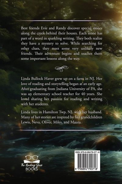Synopsis: Best friends Evie and Randy discover special stones along the creek behind their houses. Each stone has part of a word in sparkling writing. They both realize they have a mystery to solve. While searching for other clues, they meet some very unlikely new friends. Their adventure begins and teaches them some important lessons along the way. Autobiography: Linda Bullock Haver grew up on a farm in NJ. Her love of reading and storytelling began at an early age. After graduating from Indiana University of PA, she was an elementary school teacher for 40 years. She loved sharing her passion for reading and writing with her students. Linda lives in Hamilton Twp, NJ, with her husband. Many of her stories are inspired by her grandchildren Lewis, Neva, Oliver, Miles, and Maura.
