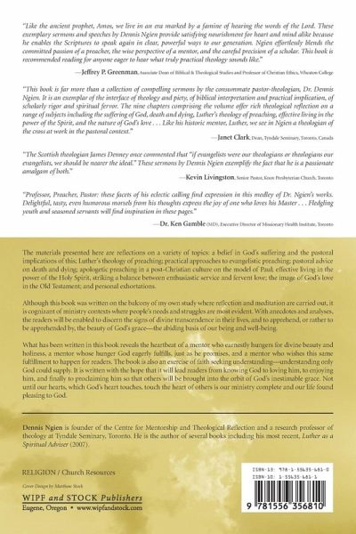 The materials presented here are reflections on a variety of topics: a belief in God's suffering and the pastoral implications of this; Luther's theology of preaching; practical approaches to evangelistic preaching; pastoral advice on death and dying; apologetic preaching in a post-Christian culture on the model of Paul; effective living in the power of the Holy Spirit, striking a balance between enthusiastic service and fervent love; the image of God's love in the Old Testament; and personal exhortations. Although this book was written on the balcony of my own study where reflection and meditation are carried out, it is cognizant of ministry contexts where people's needs and struggles are most evident. With anecdotes and analyses, the readers will be enabled to discern the signs of divine transcendence in their lives, and to apprehend, or rather to be apprehended by, the beauty of God's grace--the abiding basis of our being and well-being. What has been written in this book reveals the heartbeat of a mentor who earnestly hungers for divine beauty and holiness, a mentor whose hunger God eagerly fulfills, just as he promises, and a mentor who wishes this same fulfillment to happen for readers. The basic assumption in this book is this: a faith that is worth believing is a faith that is worth living, and thus worth commending. The book is also an exercise of faith seeking understanding--understanding only God could supply. It is written with the hope that it will lead readers from knowing God to loving him, to enjoying him, and finally to proclaiming him so that others will be brought into the orbit of God's inestimable grace. Not until our hearts, which God's heart touches, touch the heart of others is our ministry complete and our life found pleasing to God.