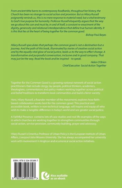 Together for the Common Good (T4CG) is a national initiative that encourages people of goodwill, especially from different Christian traditions, to work together for the common good across political and belief traditions. Its growing network comprises people of all Christian denominations, along with other faith traditions and secular allies, and includes on-the-ground social action practitioners, clergy, lay people, political thinkers, academics, theologians, commentators and policy makers. The project is guided by an independent, ecumenical steering group inspired by the partnership between Bishop David Sheppard, Archbishop Derek Worlock and Free Church leaders in Liverpool a generation ago. In A Faithful Presence: working together for the common good, Hilary Russell, a founder member of T4CG, explores how faith-based collaboration works best for the common good. This is a short accessible book, written in non-technical language, designed to be of interest to practitioners, clergy and lay, especially those who create, manage and implement social justice initiatives. It contains lots of illustrative examples of the ways in which churches are working together for the common good to strengthen civil society, through social action, service provision, community building, prayer and advocacy. As well as making use of her other experience, Hilary draws on the findings of T4CG's 12 month research process, which explored these issues through interviews, case study stories, opinion pieces and delegate input at T4CG's inaugural conference.