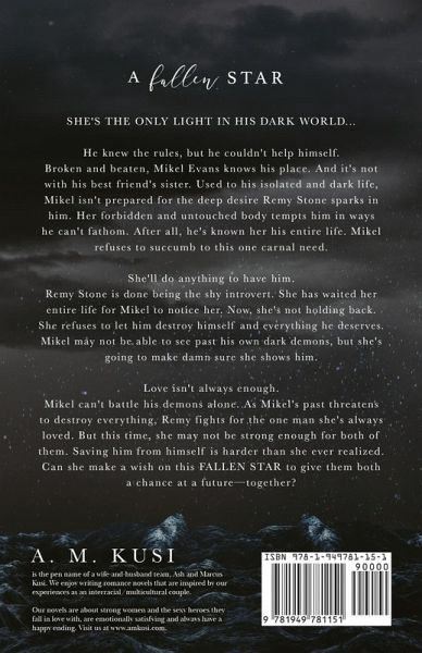 He's tormented by dark addictions. She's fighting for a lifelong dream. Can they rise from the ashes of despair and find happily ever after? Mikel Evans is broken. With all his attention focused on dealing with blackmail and a drug dependency, his day-to-day is barely survivable. So when he reflexively steps up to defend his best friend's little sister, he's blindsided when she leans in for a kiss. Remy Stone is done bottling up her emotions. And now that she's finally caught Mikel's eye, she's determined to pursue the relationship despite the red flags. But when his violent past lands her in the hospital and reveals her own hidden truth, Remy's resolve falters. Trapped in a vicious cycle of temptation and relapse, Mikel knows the only way out is to bare his soul of its twisted secrets. And though Remy wants him with all her heart, she fears his demons will always come between them. Can the embattled couple defeat the monsters that threaten their love? A Fallen Star is the emotional first book in the Shattered Cove romance series. If you like steamy relationships, damaged heroes, and stories of second chances, then you'll adore A. M. Kusi's gritty tale. Buy A Fallen Star to shoot for the heavens today! ***No cheating. HEA guaranteed.***
