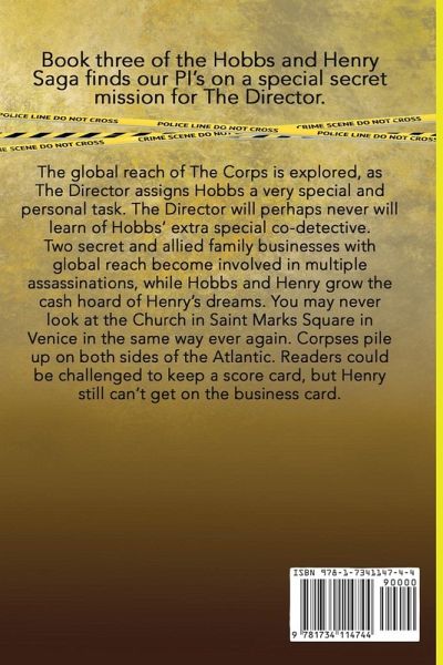 Book three of the Hobbs and Henry Saga finds our PI's on a special secret mission for The Director. The global reach of The Corps is explored, as The Director assigns Hobbs a very special and personal task. The Director will perhaps never will learn of Hobbs' extra special co-detective. Two secret and allied family businesses with global reach become involved in multiple assassinations, while Hobbs and Henry grow the cash hoard of Henry's dreams. You may never look at the Church in Saint Marks Square in Venice in the same way ever again. Corpses pile up on both sides of the Atlantic. Readers could be challenged to keep a score card, but Henry still can't get on the business card.