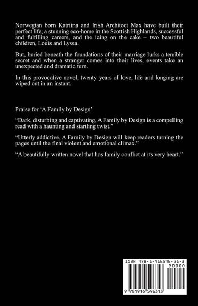 Norwegian born Katriina and Irish Architect Max have built their perfect life; a stunning eco-home in the Scottish Highlands, successful and fulfilling careers, and the icing on the cake - two beautiful children, Louis and Lyssa. But, buried beneath the foundations of their marriage lurks a terrible secret and when a stranger comes into their lives, events take an unexpected and dramatic turn. In this provocative novel, twenty years of love, life and longing are wiped out in an instant. Praise for 'A Family by Design' "Dark, disturbing and captivating, A Family by Design is a compelling read with a haunting and startling twist." "Utterly addictive, A Family by Design will keep readers turning the pages until the final violent and emotional climax." "A beautifully written novel that has family conflict at its very heart."