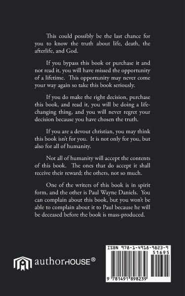 This could possibly be the last chance for you to know the truth about life, death, the afterlife, and God. If you bypass this book or purchase it and not read it, you will have missed the opportunity of a lifetime. This opportunity may never come your way again so take this book seriously. If you do make the right decision, purchase this book, and read it, you will be doing a life-changing thing, and you will never regret your decision because you have chosen the truth. If you are a devout christian, you may think this book isn't for you. It is not only for you, but also for all of humanity. Not all of humanity will accept the contents of this book. The ones that do accept it shall receive their reward; the others, not so much. One of the writers of this book is in spirit form, and the other is Paul Wayne Daniels. You can complain about this book, but you won't be able to complain about it to Paul because he will be deceased before the book is mass-produced.