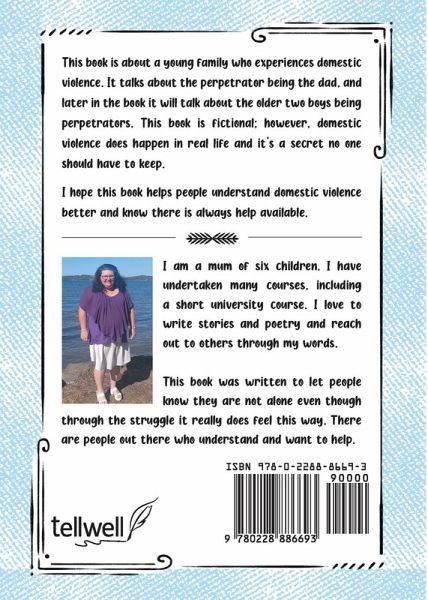 This book is about a young family who experiences domestic violence. It talks about the perpetrator being the dad, and later in the book it will talk about the older two boys being perpetrators. This book is fictional; however, domestic violence does happen in real life and it's a secret no one should have to keep. I hope this book helps people understand domestic violence better and know there is always help available.