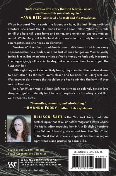 AN INSTANT NEW YORK TIMES BESTSELLER AN INSTANT INDIE BESTSELLER ONE OF 2022'S MOST ANTICIPATED READS: * BUZZFEED * EPIC READS * GOODREADS * THE NERD DAILY * UNITED BY POP * "An utterly transportive read, unfolding into a world of crumbling manors and ancient forests. Allison Saft crafts a deliberate, intricate romance that will have you as unmoored as the characters." -Chloe Gong, New York Times bestselling author of These Violent Delights A romantic YA fantasy perfect for fans of Erin A. Craig and Margaret Rogerson, about two people who find themselves competing for glory-and each other's hearts-in a magical fox hunt. When Margaret Welty spots the legendary hala, the last living mythical creature, she knows the Halfmoon Hunt will soon follow. Whoever is able to kill the hala will earn fame and riches, and unlock an ancient magical secret. While Margaret is the best sharpshooter in town, only teams of two can register, and she needs an alchemist. Weston Winters isn't an alchemist-yet. He's been fired from every apprenticeship he's landed, and his last chance hinges on Master Welty taking him in. But when Wes arrives at Welty Manor, he finds only Margaret. She begrudgingly allows him to stay, but on one condition: he must join the hunt with her. Although they make an unlikely team, they soon find themselves drawn to each other. As the hunt looms closer and tensions rise, Margaret and Wes uncover dark magic that could be the key to winning the hunt-if they survive that long. In A Far Wilder Magic, Allison Saft has written an achingly tender love story set against a deadly hunt in an atmospheric, rich fantasy world that will sweep you away. "Innovative, romantic, and intoxicating. A Far Wilder Magic is a diamond of the YA fantasy genre, with a fresh and artfully layered world and extraordinary characters to match." -Amanda Foody, author of Ace of Shades
