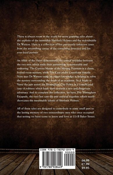 There is always room in the world for more gripping tales about the exploits of the inimitable Sherlock Holmes and the redoubtable Dr Watson. Here is a collection of five previously unknown cases from the astonishing career of the consulting detective and his ever-loyal partner. An Affair of the Heart demonstrates the critical interplay between the two men which made their partnership so memorable and endearing. The Curious Matter of the Missing Pearmain is a classic locked-room mystery, while The Case of the Cuneiform Suicide Note sees Dr Watson using his expert knowledge in helping to solve the mystery surrounding the death of an academic. In A Study in Verse the pair assists the Birmingham City Police in a complicated case of robbery which leads them towards a new and dangerous adversary. And to complete the collection, we have The Trimingham Escapade, the very last case the pair enjoyed together, which neatly showcases the inestimable talents of Sherlock Holmes. All of these tales are designed to contribute in some small part to the lasting memory of two extraordinary men who once occupied that setting we have come to know and love as 221B Baker Street.