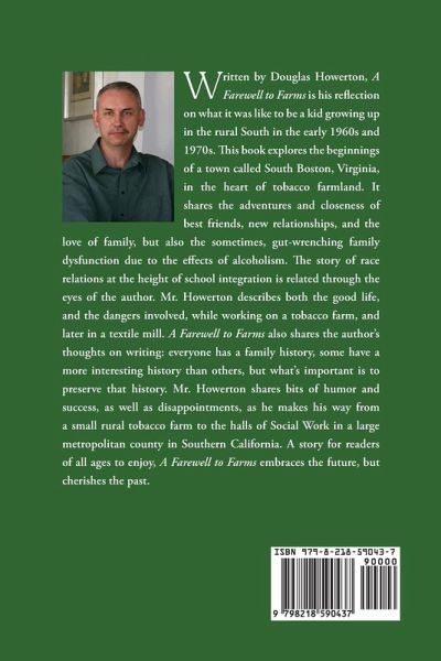 A Farewell to Farms is a memoir and covers the time period from the author's birth in a small farming town in rural Southern Virginia in the mid-1950s, to the present. The author focuses on specific parts of his life in the 1960s and 1970s. Included is an in-depth reflection of his family's struggle to make a living on a tobacco farm and in a textile mill. The author discusses the anguish of dealing with an alcoholic father, the struggle to find meaningful employment and establish close personal relationships. The author writes about the closeness shared with his mom and the strength she provided to her children. Then there were the happy times spent with his grandparents and other relatives, hanging out on the front porch or under an old oak tree shelling butterbeans, or at the old country store just having a cold soda. The author intersperses stories of his childhood adventures, entertainment and games. He also shares some of the history of his town and relates how it's important to preserve and share history. He shares historical information about childhood labor, race relations/integration and poverty. Mr. Howerton discusses the challenges of writing, obtaining a good education and his twenty-seven-year struggle to obtain a degree. A Farewell to Farms provides the reader a window into a simpler time. The author invites the reader to share in his journey from a small tobacco farming town in Southern Virginia to the halls of social work in Southern California. It is important to embrace the future, but remember the past.