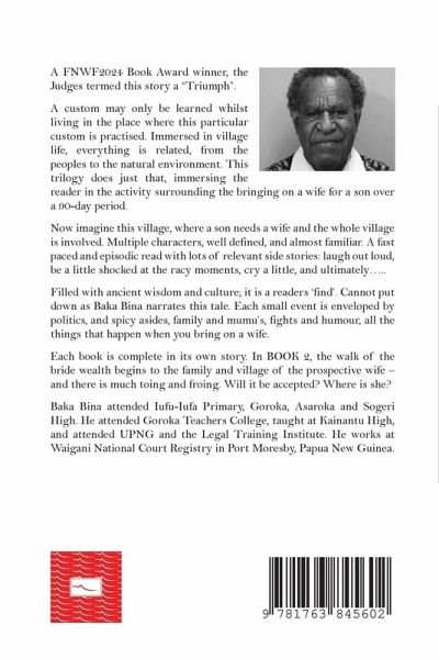 A FNWF2024 Book Award winner, the Judges termed this story a "Triumph". A custom may only be learned whilst living in the place where this particular custom is practised. Immersed in village life, everything is related, from the peoples to the natural environment. This trilogy does just that, immersing the reader in the activity surrounding the bringing on a wife for a son over a 90-day period. Now imagine this village, where a son needs a wife and the whole village is involved. Multiple characters, well defined, and almost familiar. A fast paced and episodic read with lots of relevant side stories: laugh out loud, be a little shocked at the racy moments, cry a little, and ultimately..... Filled with ancient wisdom and culture; it is a readers 'find'. Cannot put down as Baka Bina narrates this tale. Each small event is enveloped by politics, and spicy asides, family and mumu's, fights and humour, all the things that happen when you bring on a wife. Each book is complete in its own story. In BOOK 2, the walk of the bride wealth begins to the family and village of the prospective wife - and there is much toing and froing. Will it be accepted? Where is she? Baka Bina attended Iufu-Iufa Primary, Goroka, Asaroka and Sogeri High. He attended Goroka Teachers College, taught at Kainantu High, and attended UPNG and the Legal Training Institute. He works at Waigani National Court Registry in Port Moresby, Papua New Guinea.