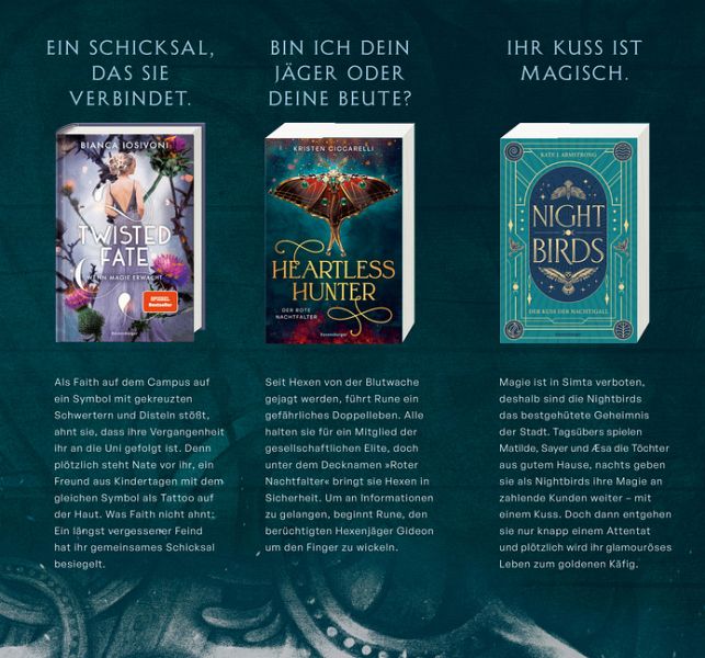 Ihr Leben lang hat Freya verheimlicht, welche Magie in ihr schlummert. Bis sie…mehr„A Fate Inked in Blood“ Danielle L. Jensen hat eine spannende Grundidee und starke Ansätze, konnte mich aber leider nicht voll überzeugen. Besonders das Setting und die Namensgebung wirkten auf mich eher künstlich als atmosphärisch – für zwischendurch okay, aber für mich persönlich kein Highlight.