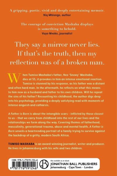 'A gripping, poetic, vivid and deeply entertaining memoir.' - Niq Mhlongo, author 'The courage of conviction Mashaba displays is something to behold.' - Vuyo Mvoko, journalist They say a mirror never lies. If that's the truth, then my reflection was of a broken man. When Tumiso Mashaba's father, Neo 'Snowy' Mashaba, dies at 55, it provokes in him an intense emotional reaction. Tumiso is stunned by his response, as his father was a distant and often hard man. In the aftermath, he reflects on what this means to him now as a husband and father to his own children. Will he repeat the sins of his father? Recounting his childhood, the author digs deep into his psychology, providing a deeply satisfying read with moments of intense anguish and catharsis. A Father is Born is about intangible scars - inflicted by those closest to us - that we carry from childhood into the rest of our lives and the relationships we form along the way. Covering themes of fatherhood, masculinity, generational trauma, abuse and mental health, A Father is Born unveils a heartrending portrait of a family trying to survive against the backdrop of a gritty, modern South Africa. TUMISO MASHABA is an award-winning journalist, writer and producer. He lives in Johannesburg with his wife and two children.