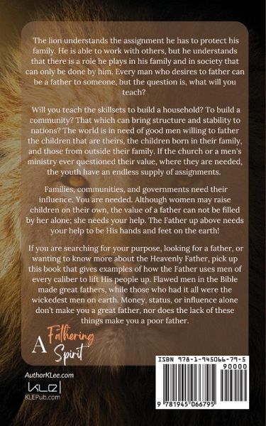 The lion understands the assignment he has to protect his family. He is able to work with others, but he understands that there is a role he plays in his family and in society that can only be done by him. Every man who desires to father can be a father to someone, but the question is, what will you teach? Will you teach the skillsets to build a household? To build a community? That which can bring structure and stability to nations? The world is in need of good men willing to father the children that are theirs, the children born in their family, and those from outside their family. If the church or a men's ministry ever questioned their value, where they are needed, the youth have an endless supply of assignments. Families, communities, and governments need their influence. You are needed. Although women may raise children on their own, the value of a father can not be filled by her alone; she needs your help. The Father up above needs your help to be His hands and feet on the earth! If you are searching for your purpose, looking for a father, or wanting to know more about the Heavenly Father, pick up this book that gives examples of how the Father uses men of every caliber to lift His people up. Flawed men in the Bible made great fathers, while those who had it all were the wickedest men on earth. Money, status, or influence alone don't make you a great father, nor does the lack of these things make you a poor father.