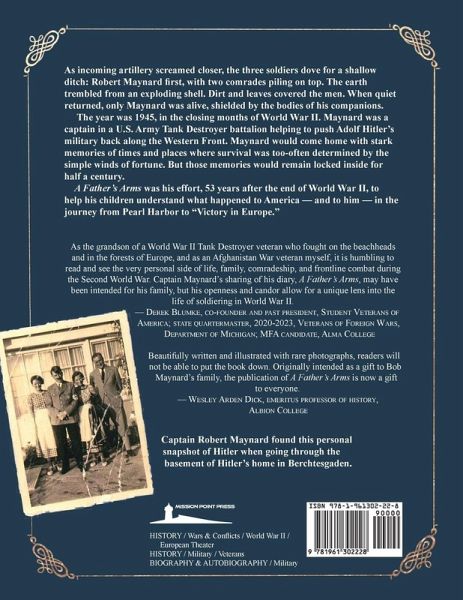 Robert Maynard was a captain in a U.S. Army Tank Destroyer battalion helping to push Adolf Hitler's military back along the Western Front. Maynard would come home with stark memories of times and places where survival was too-often determined by the simple winds of fortune. But those memories would remain locked inside for half a century. Like many in his generation, he would try to set aside his war experiences and get on with raising his family. Finally, near the end of the 20th Century, he compiled this volume, which his children have now chosen to share. A Father's Arms was his effort, 53 years after the end of World War II, to help his children understand what happened to America - and to him - in the journey from Pearl Harbor to "Victory in Europe."