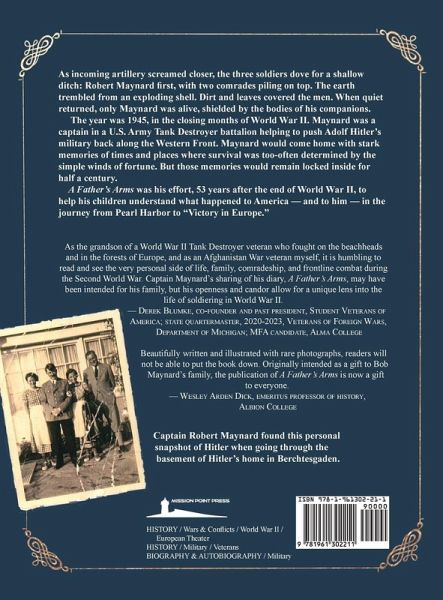 Robert Maynard was a captain in a U.S. Army Tank Destroyer battalion helping to push Adolf Hitler's military back along the Western Front. Maynard would come home with stark memories of times and places where survival was too-often determined by the simple winds of fortune. But those memories would remain locked inside for half a century. Like many in his generation, he would try to set aside his war experiences and get on with raising his family. Finally, near the end of the 20th Century, he compiled this volume, which his children have now chosen to share. A Father's Arms was his effort, 53 years after the end of World War II, to help his children understand what happened to America - and to him - in the journey from Pearl Harbor to "Victory in Europe."