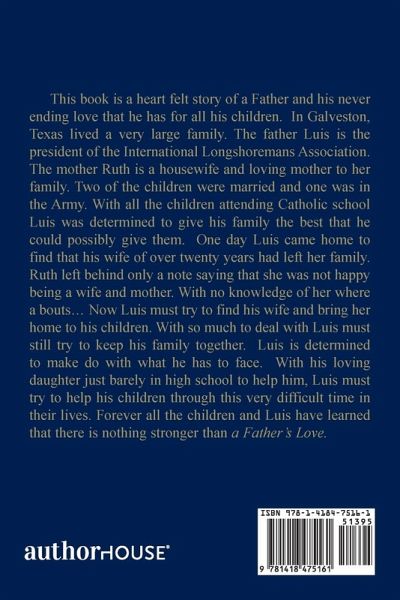 This book is a heart felt story of a Father and his never ending love that he has for all his children. In Galveston, Texas lived a very large family. The father Luis is the president of the International Longshoremans Association. The mother Ruth is a housewife and loving mother to her family. Two of the children were married and one was in the Army. With all the children attending Catholic school Luis was determined to give his family the best that he could possibly give them. One day Luis came home to find that his wife of over twenty years had left her family. Ruth left behind only a note saying that she was not happy being a wife and mother. With no knowledge of her where a bouts... Now Luis must try to find his wife and bring her home to his children. With so much to deal with Luis must still try to keep his family together. Luis is determined to make do with what he has to face. With his loving daughter just barely in high school to help him, Luis must try to help his children through this very difficult time in their lives. Forever all the children and Luis have learned that there is nothing stronger than a Father's Love.