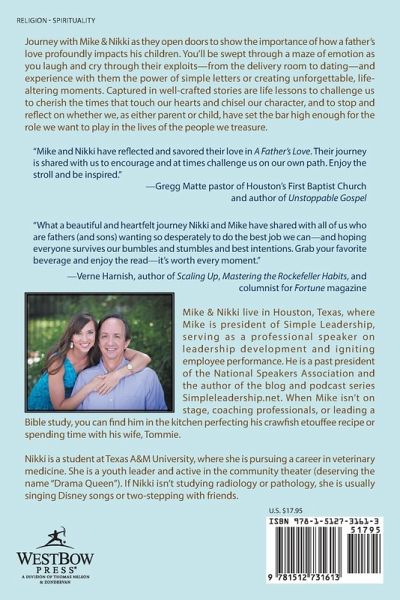Journey with Mike & Nikki as they open doors to show the importance of how a father's love profoundly impacts his children. You'll be swept through a maze of emotion as you laugh and cry through their exploits-from the delivery room to dating-and experience with them the power of simple letters or creating unforgettable, life-altering moments. Captured in well-crafted stories are life lessons to challenge us to cherish the times that touch our hearts and chisel our character, and to stop and reflect on whether we, as either parent or child, have set the bar high enough for the role we want to play in the lives of the people we treasure. "Mike and Nikki have reflected and savored their love in A Father's Love. Their journey is shared with us to encourage and at times challenge us on our own path. Enjoy the stroll and be inspired." -Gregg Matte pastor of Houston's First Baptist Church and author of Unstoppable Gospel "What a beautiful and heartfelt journey Nikki and Mike have shared with all of us who are fathers (and sons) wanting so desperately to do the best job we can-and hoping everyone survives our bumbles and stumbles and best intentions. Grab your favorite beverage and enjoy the read-it's worth every moment." -Verne Harnish, author of Scaling Up, Mastering the Rockefeller Habits, and columnist for Fortune magazine