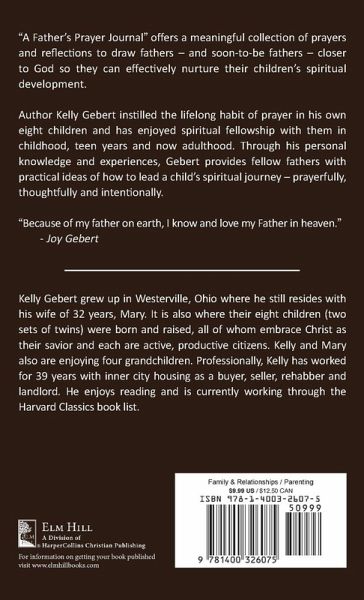 A Father's Prayer Journal offers a meaningful collection of prayers and reflections to draw fathers--and soon-to-be fathers--closer to God so they can effectively nurture their children's spiritual development. It provides a practical resource for capturing personal thoughts and devotions.