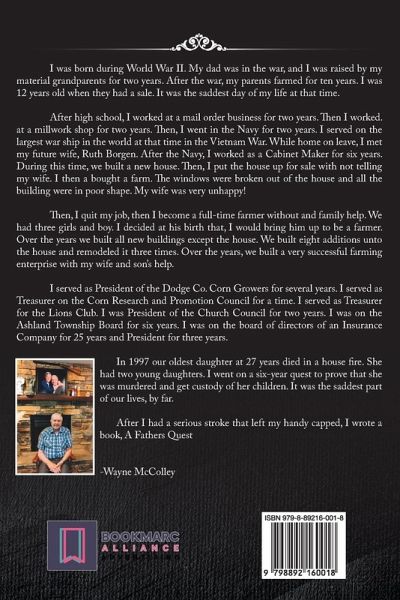 I was born during World War II. My dad was in the war, and I was raised by my material grandparents for two years. After the war, my parents farmed for ten years. I was 12 years old when they had a sale. It was the saddest day of my life at that time. After high school, I worked at a mail order business for two years. Then I worked. at a millwork shop for two years. Then, I went in the Navy for two years. I served on the largest war ship in the world at that time in the Vietnam War. While home on leave, I met my future wife, Ruth Borgen. After the Navy, I worked as a Cabinet Maker for six years. During this time, we built a new house. Then, I put the house up for sale with not telling my wife. I then a bought a farm. The windows were broken out of the house and all the building were in poor shape. My wife was very unhappy! Then, I quit my job, then I become a full-time farmer without and family help. We had three girls and boy. I decided at his birth that, I would bring him up to be a farmer. Over the years we built all new buildings except the house. We built eight additions unto the house and remodeled it three times. Over the years, we built a very successful farming enterprise with my wife and son's help. I served as President of the Dodge Co. Corn Growers for several years. I served as Treasurer on the Corn Research and Promotion Council for a time. I served as Treasurer for the Lions Club. I was President of the Church Council for two years. I was on the Ashland Township Board for six years. I was on the board of directors of an Insurance Company for 25 years and President for three years. In 1997 our oldest daughter at 27 years died in a house fire. She had two young daughters. I went on a six-year quest to prove that she was murdered and get custody of her children. It was the saddest part of our lives, by far. After I had a serious stroke that left my handy capped, I wrote a book, A Fathers Quest -Wayne McColley