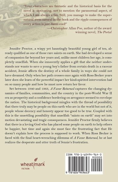 Jennifer Proctor, a wispy yet hauntingly beautiful young girl of ten, already qualified as one of those rare saints on earth. She had developed a sense of compassion far beyond her years and, unlike most children her age, is completely unselfish. When she innocently applies a gift that she neither understands nor wants to save a young boy's father from certain death in a racecar accident, Jennie affects the destiny of a whole family in ways she could not have dreamed. Only when her path crosses once again with Ross Becker years later does she learn of the powerful impact her kind-spirited intervention had on so many people and how he must now return her favor. Set between 1940 and 1963, A Favor Returned captures the changing dynamics of families, communities, and the country in the post-World War II era as prosperity and a confidence bordering on arrogance seemed to envelope the nation. The historical background mingles with the thread of possibility that there truly may be people on this earth who are in the world but not of it, people whose decency and honesty appear too good to be true. Coupled with this is the unsettling possibility that unselfish "saints on earth" may set into motion devastating and tragic consequences. Jennifer Proctor firmly believes that there is a loving God who has placed some people on earth to help others be happier, but time and again she must face the frustrating fact that He doesn't explain how the process is supposed to work. When Ross Becker is faced with the final heart-wrenching dilemma of A Favor Returned, he at last realizes the desperate and utter truth of Jennie's frustration.