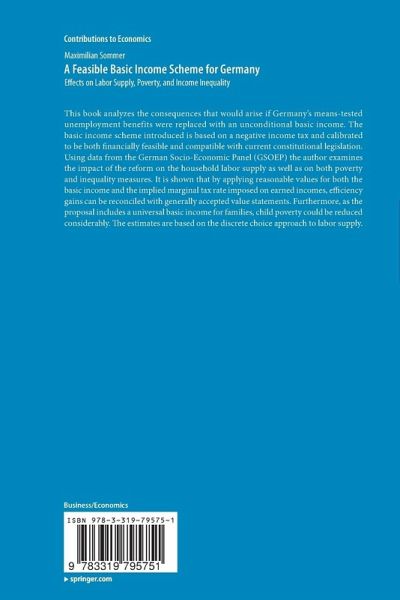 This book analyzes the consequences that would arise if Germany's means-tested unemployment benefits were replaced with an unconditional basic income. The basic income scheme introduced is based on a negative income tax and calibrated to be both financially feasible and compatible with current constitutional legislation. Using data from the German Socio-Economic Panel (GSOEP) the author examines the impact of the reform on the household labor supply as well as on both poverty and inequality measures. It is shown that by applying reasonable values for both the basic income and the implied marginal tax rate imposed on earned incomes, efficiency gains can be reconciled with generally accepted value statements. Furthermore, as the proposal includes a universal basic income for families, child poverty could be reduced considerably. The estimates are based on the discrete choice approach to labor supply.
