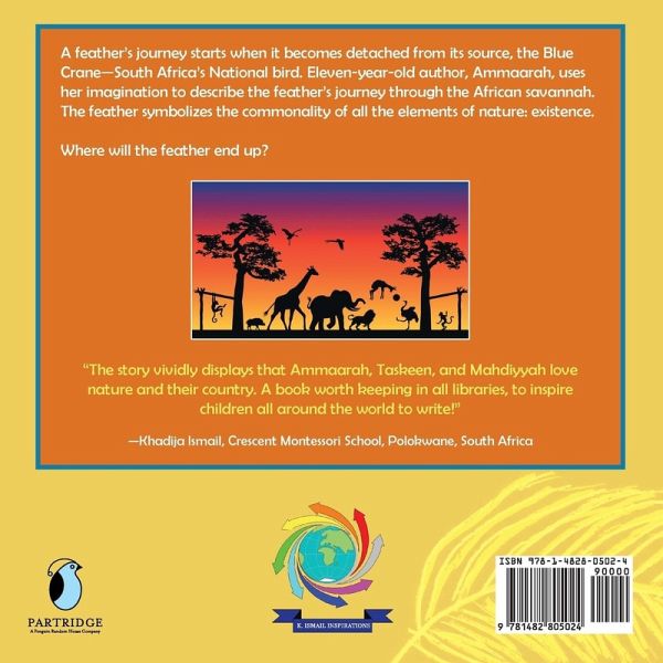 A feather's journey starts when it becomes detached from its source, the Blue Crane-South Africa's National bird. Eleven-year-old author, Ammaarah, uses her imagination to describe the feather's journey through the African savannah. The feather symbolizes the commonality of all the elements of nature: existence. Where will the feather end up? "The story vividly displays that Ammaarah, Taskeen, and Mahdiyyah love nature and their country. A book worth keeping in all libraries, to inspire children all around the world to write!"-Khadija Ismail, Crescent Montessori School, Polokwane, South Africa