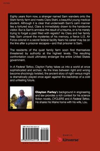 Eighty years from now, a stranger named Sam wanders onto the Stahl family farm and meets Clara Stahl, a beautiful young medical student. Although it is clear that underneath Sam's calm manner lies a tortured soul, Clara is immediately drawn to the handsome visitor. But is Sam's amnesia the result of a trauma, or is he merely trying to forget a past filled with regrets? As Clara and her family help Sam unravel the mysteries of his memory, a fierce U.S. Air Force colonel in a secret federal facility fears his career may be on the line after a prisoner escapes-and that prisoner is Sam. The residents of the quiet family farm soon find themselves threatened by authority at the highest levels. The resulting confrontation could ultimately endanger the entire United States government. In A Federal Tattoo, Clayton Farley takes us into a world at once sophisticated and archaic. As the lines between right and wrong become shockingly twisted, the ancient story of right versus might is dramatically played once again against the backdrop of a cold and unfeeling future.