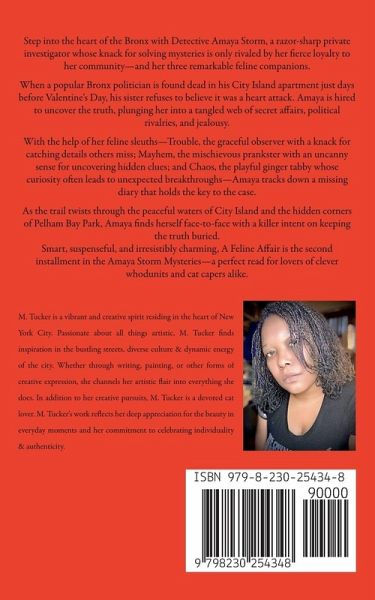 Step into the heart of the Bronx with Detective Amaya Storm, a razor-sharp private investigator whose knack for solving mysteries is only rivaled by her fierce loyalty to her community-and her three remarkable feline companions. When a popular Bronx politician is found dead in his City Island apartment just days before Valentine's Day, his sister refuses to believe it was a heart attack. Amaya is hired to uncover the truth, plunging her into a tangled web of secret affairs, political rivalries, and jealousy. With the help of her feline sleuths-Trouble, the graceful observer with a knack for catching details others miss; Mayhem, the mischievous prankster with an uncanny sense for uncovering hidden clues; and Chaos, the playful ginger tabby whose curiosity often leads to unexpected breakthroughs-Amaya tracks down a missing diary that holds the key to the case. As the trail twists through the peaceful waters of City Island and the hidden corners of Pelham Bay Park, Amaya finds herself face-to-face with a killer intent on keeping the truth buried. Smart, suspenseful, and irresistibly charming, A Feline Affair is the second installment in the Amaya Storm Mysteries-a perfect read for lovers of clever whodunits and cat capers alike.