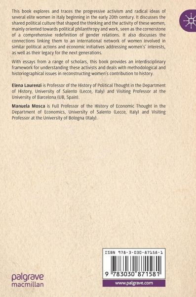 This book explores and traces the progressive activism and radical ideas of several elite women in Italy beginning in the early 20th century. It discusses the shared political culture that shaped the thinking and the activity of these women, mainly oriented towards political philanthropy and work, seen as the cornerstone of a comprehensive redefinition of gender relations. It also discusses the connections linking them to an international network of women involved in similar political actions and economic initiatives addressing women's' interests, as well as their legacy for the next generations.