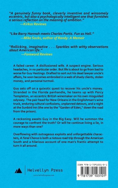 A failed career. A disillusioned wife. A suspect engine. Serious headaches, in no particular order. But life is about to go from bad to worse for Guy Hastings. Drafted to sort out his dead lawyer uncle's affairs, he soon becomes embroiled in a web of shady clients, stolen money, and personal turmoil. Guy sets off on a quixotic quest to recover his uncle's money. Stranded in the Florida panhandle, he teams up with Percy Templeton, an eccentric British winemaker on his own misguided odyssey. The pair head for New Orleans in the Englishman's wine truck, enduring cultural confusions, unplanned detours, and a night at the Sunbird Inn (the one by the "Garden of Eden," down the road from the prison). A reckoning awaits Guy in the Big Easy. Will he summon the courage to confront the truth? Or will he continue living a lie, in more ways than one? Overflowing with outrageous exploits and unforgettable characters, A Feral Chorus is both a riotous road trip through the American South and a hilarious account of one man's frantic attempt to turn it all around.