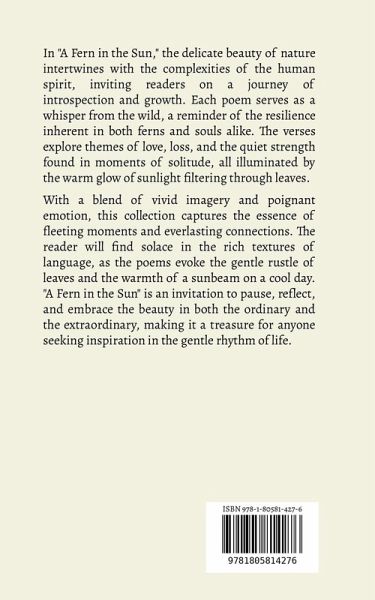 In "A Fern in the Sun," the delicate beauty of nature intertwines with the complexities of the human spirit, inviting readers on a journey of introspection and growth. Each poem serves as a whisper from the wild, a reminder of the resilience inherent in both ferns and souls alike. The verses explore themes of love, loss, and the quiet strength found in moments of solitude, all illuminated by the warm glow of sunlight filtering through leaves. With a blend of vivid imagery and poignant emotion, this collection captures the essence of fleeting moments and everlasting connections. The reader will find solace in the rich textures of language, as the poems evoke the gentle rustle of leaves and the warmth of a sunbeam on a cool day. "A Fern in the Sun" is an invitation to pause, reflect, and embrace the beauty in both the ordinary and the extraordinary, making it a treasure for anyone seeking inspiration in the gentle rhythm of life.