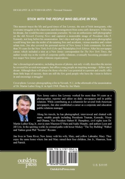 This memoir traces the life and good times of Jim Lowney, the son of Irish immigrants, who overcame struggles in the classroom and discouragement from some early detractors. Following his dream, Jim would become a passionate journalist. He was an enthusiastic staff photographer on the old Newark Evening News and captured a memorable image of President John F. Kennedy, not long before his assassination. Jim's days and nights as a spot news photographer would bring him into the midst of devastating fires and accidents, vicious murders and violent urban riots. Jim also covered the personal stories of New Jersey's Irish community for more than 30 years for the New York Irish Echo and Philadelphia Irish Edition. After his newspaper career, which included a stint as a New Jersey correspondent for The New York Times, the author would rise in the world of corporate public relations, eventually becoming president of two major New Jersey public relations organizations. Jim's chronological narrative, including dozens of photos, not only vividly describes the stories he covered for several newspapers, but offers young people an inspiring message - follow one's dream. Although there will always be those who don't see potential in a person and cruelly offer them little hope of success, there are still the few good people who have the vision to believe and encourage a struggler. Cover photo: Lowney photographing a fire in Newark, N.J., in the aftermath of the assassination of Dr. Martin Luther King Jr. in April 1968. Photo by Joe Marts. New Jersey native Jim Lowney worked for more than 50 years as a photographer, reporter and editor on daily newspapers and in public relations. While contributing as a columnist for several Irish American newspapers, Jim also established a career as a corporate and education public relations manager. Along his travels, he has photographed, interviewed and chatted with many notable people including Presidents Truman, Kennedy, Nixon and Ob