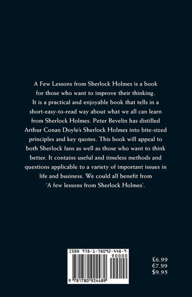 A Few Lessons from Sherlock Holmes is a book for those who want to improve their thinking. It is a practical and enjoyable book that tells in a short-easy-to-read way about what we all can learn from Sherlock Holmes. Peter Bevelin has distilled Arthur Conan Doyle's Sherlock Holmes into bite-sized principles and key quotes. This book will appeal to both Sherlock fans as well as those who want to think better. It contains useful and timeless methods and questions applicable to a variety of important issues in life and business. We could all benefit from 'A few lessons from Sherlock Holmes'.