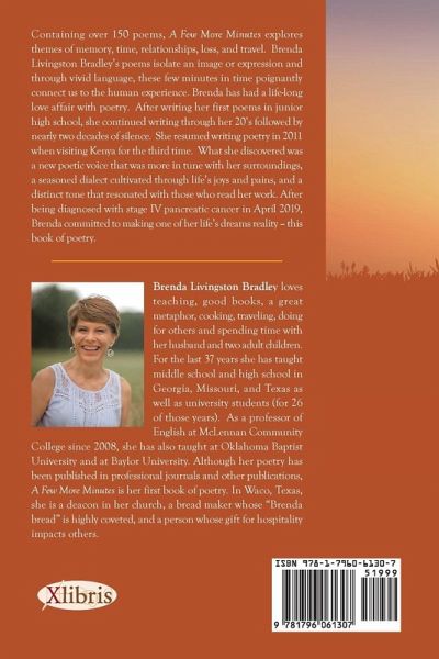 Containing over 150 poems, A Few More Minutes explores themes of memory, time, relationships, loss, and travel. Brenda Livingston Bradley's poems isolate an image or expression and through vivid language, these few minutes in time poignantly connect us to the human experience. Brenda has had a life-long love affair with poetry. After writing her first poems in junior high school, she continued writing through her 20's followed by nearly two decades of silence. She resumed writing poetry in 2011 when visiting Kenya for the third time. What she discovered was a new poetic voice that was more in tune with her surroundings, a seasoned dialect cultivated through life's joys and pains, and a distinct tone that resonated with those who read her work. After being diagnosed with stage IV pancreatic cancer in April 2019, Brenda committed to making one of her life's dreams reality - this book of poetry.