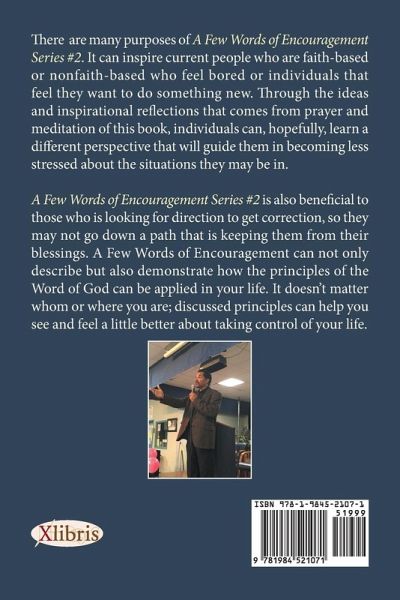 There are many purposes of A Few Words of Encouragement. It can inspire current people who are faith-based or nonfaith-based who feel bored or individuals that feel they want to do something new. Through the ideas and inspirational reflections that comes from prayer and meditation of this book, individuals can, hopefully, learn a different perspective that will guide them in becoming less stressed about the situations they may be in. A Few Words of Encouragement is also beneficial to those who is looking for direction to get correction, so they may not go down a path that is keeping them from their blessings. A Few Words of Encouragement can not only describe but also demonstrate how the principles of the Word of God can be applied in your life. It doesnt matter whom or where you are; discussed principles can help you see and feel a little better about taking control of your life.