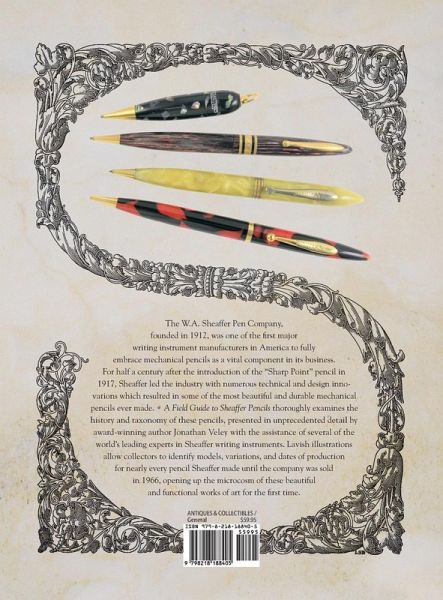 A Field Guide to Sheaffer's Pencils has won several independent book awards: 2023 Next Generation Indie Book Awards - Gold Medal Winner in general nonfiction, and also named Finalist in both the Coffee Table/Photography and the Specialty/Novelty Book categories. 2024 IBPA Ben Franklin Awards - Silver Award Winner, Craft & Hobby/Home & Garden. 2024 Best Indie Book Award (BIBA) - Winner, History The W.A. Sheaffer Pen Company, founded in 1912, was one of the first major writing instrument manufacturers in America to fully embrace mechanical pencils as a vital component in its business. For half a century after the introduction of the "Sharp Point" pencil in 1917, Sheaffer led the industry with numerous technical and design innovations which resulted in some of the most beautiful and durable mechanical pencils ever made. A Field Guide to Sheaffer Pencils thoroughly examines the history and taxonomy of these pencils, presented in unprecedented detail by award-winning author Jonathan Veley with the assistance of several of the world's leading experts in Sheaffer writing instruments. Lavish illustrations allow collectors to identify models, variations, and dates of production for nearly every pencil Sheaffer made until the company was sold in 1966, opening up the microcosm of these beautiful and functional works of art for the first time.