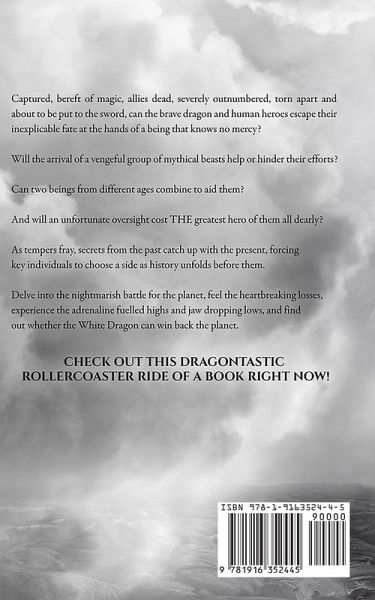 Captured, bereft of magic, allies dead, severely outnumbered, torn apart and about to be put to the sword, can the brave dragon and human heroes escape their inexplicable fate at the hands of a being that knows no mercy? Will the arrival of a vengeful group of mythical beasts help or hinder their efforts? Can two beings from different ages combine to aid them? And will an unfortunate oversight cost THE greatest hero of them all dearly? As tempers fray, secrets from the past catch up with the present, forcing key individuals to choose a side as history unfolds before them. Delve into the nightmarish battle for the planet, feel the heartbreaking losses, experience the adrenaline fuelled highs and jaw dropping lows, and find out whether the White Dragon can win back the planet. Check out this dragontastic, rollercoaster ride of a book right NOW!