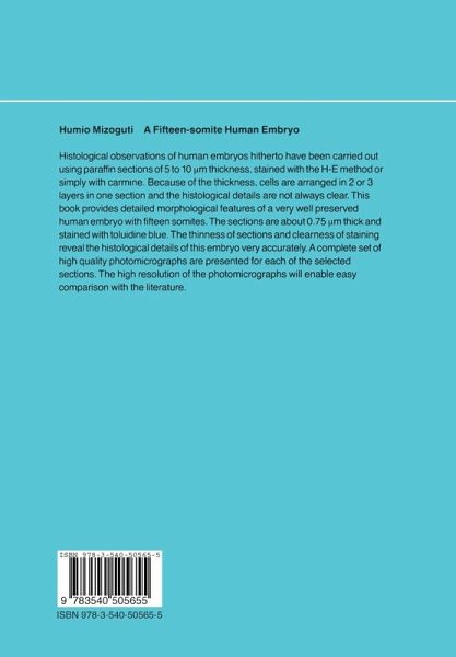 Histological observations of human embryos hitherto have been carried out using paraffin sections of 5 to 10 µm thickness, stained with the H-E method or simply with carmine. Because of the thickness, cells are arranged in 2 or 3 layers in one section and the histological details are not always clear. This book provides detailed morphological features of a very well preserved human embryo with fifteen somites. The sections are about 0.75 µm thick and stained with toluidine blue. The thinness of sections and clearness of staining reveal the histological details of this embryo very accurately. A complete set of high quality photomicrographs are presented for each of the selected sections. The high resolution of the photomicrographs will enable easy comparison with the literature. The clear presentation in this book of embryonic development is increasingly important and highly relevant for in-vitro fertilization, and thus of interest to reproductive biologists as well as anatomists.