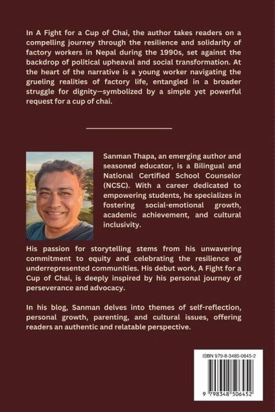 A Fight for a Cup of Chai Sanman Thapa lost his hand to the machines of a Kathmandu shoe factory. Poverty had forced him into child labor, but even loss and hardship could not silence his fight for dignity. A Fight for a Cup of Chai is his searing memoir of resilience and resistance, revealing the human cost of exploitation and the courage it takes to demand justice. From the factory floors of Nepal to the struggle for education and survival, Sanman's journey is both deeply personal and powerfully universal. A raw and unforgettable story for readers who believe in justice, resilience, and the unbreakable human spirit.