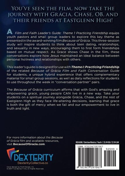 A Film and Faith Leader’s Guide: Theme 1 Practicing Friendship equips youth pastors and small group leaders to explore the key theme of Practicing Friendship as presented in the award-winning film Because of Grácia. This three-session study will inspire students to think about teen dating, relationships, and sexuality in new ways, encouraging them to first form friendships based on mutual respect. As Grace shows Chase in the film, these conversations explore how Jesus maintained an ideal balance between personal holiness and relationships with others. This leader’s guide is designed for use with Theme I: Practicing Friendship of the related Because of Grácia Film and Faith Conversation Guide for students, a unique hybrid experience that offers complementary material for small group sessions, as well as daily reflections for students to use throughout the week in "conversation partner" pairs. The Because of Grácia curriculum affirms that with God’s amazing and empowering grace, young people CAN live in a new way. Take your students on a spiritual journey alongside Grácia, Chase, and the rest of Eastglenn High as they face life-altering decisions, learning that grace is both the gift of mercy when we fail and our empowerment to live in truth and light.