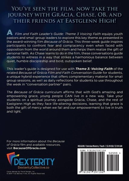 A Film and Faith Leader's Guide: Theme 3 Voicing Faith equips youth pastors and small group leaders to explore the key theme of Voicing Faith in public as presented in the award-winning film. This three-week guide inspires participants to confront fear and complacency even when faced with opposition from the world around them and helps them realize the gift of personal faith. As Chase learns to do in the film, these conversations guide students to witness in a way that strikes a harmonious balance between quiet, humble discipleship and bold, outspoken belief. This leader's guide is designed for use with Theme 3: Voicing Faith of the related Because of Grácia Film and Faith Conversation Guide for students, a unique hybrid experience that offers complementary material for small group sessions, as well as daily reflections for students to use throughout the week in "conversation partner" pairs. The Because of Grácia curriculum affirms that with God's amazing and empowering grace, young people CAN live in a new way. Take your students on a spiritual journey alongside Grácia, Chase, and the rest of Eastglenn High as they face life-altering decisions, learning that grace is both the gift of mercy when we fail and our empowerment to live in truth and light.