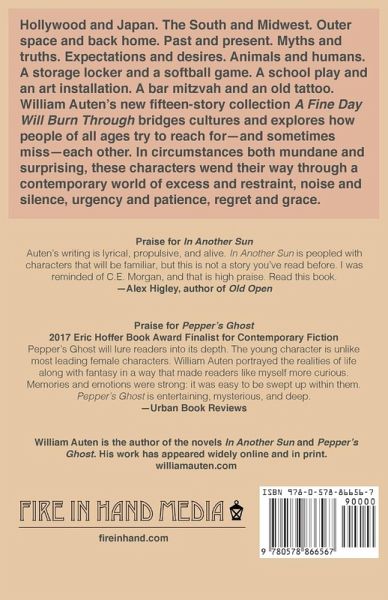 Hollywood and Japan. The South and Midwest. Outer space and back home. Past and present. Myths and truths. Expectations and desires. Animals and humans. A storage locker and a softball game. A school play and an art installation. A bar mitzvah and an old tattoo. William Auten's new fifteen-story collection A Fine Day Will Burn Through bridges cultures and explores how people of all ages try to reach for-and sometimes miss-each other. In circumstances both mundane and surprising, these characters wend their way through a contemporary world of excess and restraint, noise and silence, urgency and patience, regret and grace.