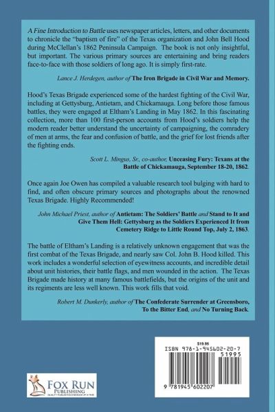The Battle of Eltham's Landing on May 7, 1862 was the baptism by fire for the Texas Brigade of Gen. John Bell Hood. The Texans distinguished themselves throughout the war as members of Robert E. Lee's Army of Northern Virginia. The Battle of Eltham's Landing was considered small, compared to the battles the brigade fought soon afterwards: Gaines' Mill, Second Manassas/Second Bull Run, Sharpsburg/Antietam, Gettysburg and Chickamauga. However, the brunt of the fighting at Eltham's Landing was done by the Texans. Hood's Texas Brigade's first combat experience proved they were a force to be reckoned with. In these accounts, the soldiers wrote how bravely the brigade fought in its first battle. Newspapers throughout Texas, Georgia and the whole south expressed their pride about the gallantry and aggressiveness of Hood's Brigade in their first battle, and began building the reputation of Hood's Texans becoming Robert E. Lee's "Grenadier Guard." Confederate General Gustavus Smith wrote "the brunt of the contest was borne by the Texans, and to them is due the largest share of the honors." This collection of source material and photographs provide a valuable view of this overlooked, early battle through the eyes of the Texans, that reflected pride not only in themselves, but in fellow brigade members of the 18th Georgia and Hampton's Legion.