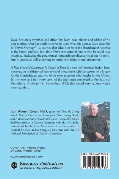 Dave Benson is mystified and driven by death bead visions and wishes of his dear mother. After her death he embarks upon what his partner Gary describes as ""Dave's Odyssey"" - a journey that takes him from the Heartland of America to the South, and back into time. Dave encounters far more than he could have imagined, including the paranormal, extraordinary discoveries about his roots, family secrets, as well as coming to terms with identity and orientation. A Fine Line of Distinction: In Search of Roots is a work of historical fiction base, however, on the historical facts of six of the author's wife's ancestors who fought for the Confederacy, and two of his own ancestors who fought for the Union. In the novel and in history seven of the eight men converged at the Battle of Sharpsburg (Antietam) in September, 1862; five would survive, one would never admit it.