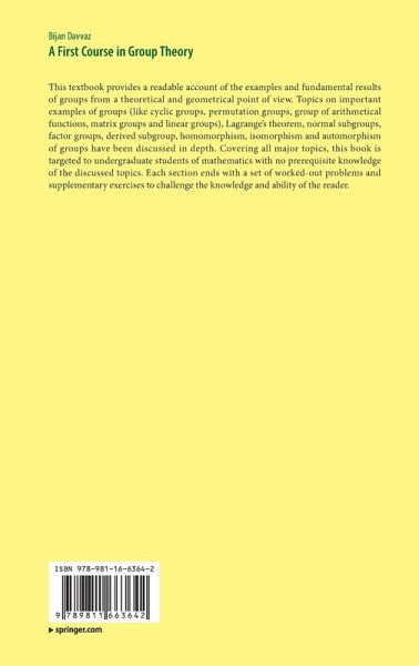 Preliminaries Notions.- Symmetries of Shapes.- Binary Operations.- Cyclic Groups.- Inverse Functions and Permutations.- Group of Arithmetical Functions.- Matrix Groups.- Translation and Scaling Matrices.- Cosets of Subgroups and Lagrange's Theorem.- Normal Subgroups and Factor Groups.- Some Special Subgroups.- Commutators and Derived Subgroups.- Maximal Subgroups.- Group Homomorphisms.- Homomorphisms and Their Properties.- Cayley's Theorem.- Another View of Linear Groups.