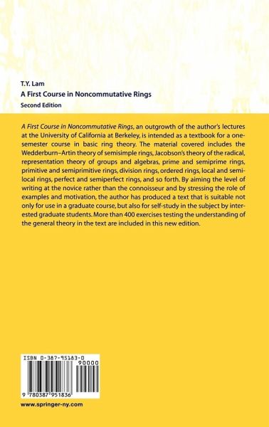A First Course in Noncommutative Rings, an outgrowth of the author's lectures at the University of California at Berkeley, is intended as a textbook for a one-semester course in basic ring theory. The material covered includes the Wedderburn-Artin theory of semisimple rings, Jacobson's theory of the radical, representation theory of groups and algebras, prime and semiprime rings, local and semilocal rings, perfect and semiperfect rings, etc. By aiming the level of writing at the novice rather than the connoisseur and by stressing th the role of examples and motivation, the author has produced a text that is suitable not only for use in a graduate course, but also for self- study in the subject by interested graduate students. More than 400 exercises testing the understanding of the general theory in the text are included in this new edition.