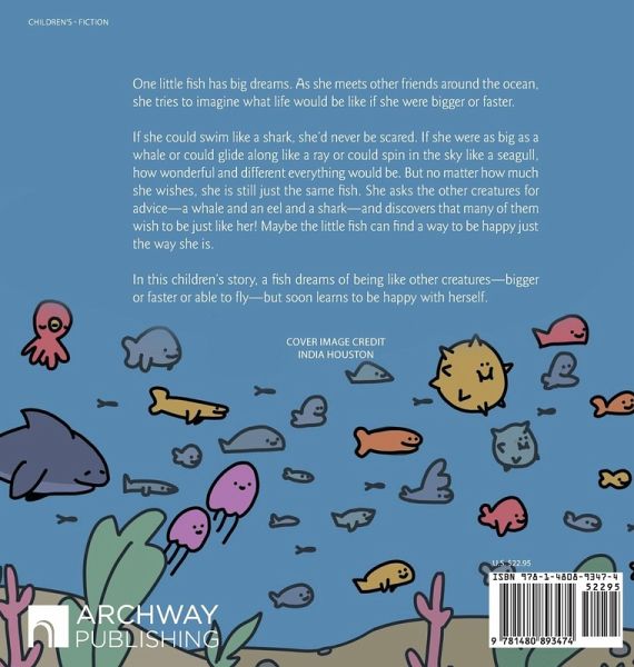 One little fish has big dreams. As she meets other friends around the ocean, she tries to imagine what life would be like if she were bigger or faster. If she could swim like a shark, she'd never be scared. If she were as big as a whale or could glide along like a ray or could spin in the sky like a seagull, how wonderful and different everything would be. But no matter how much she wishes, she is still just the same fish. She asks the other creatures for advice-a whale and an eel and a shark-and discovers that many of them wish to be just like her! Maybe the little fish can find a way to be happy just the way she is. In this children's story, a fish dreams of being like other creatures-bigger or faster or able to fly-but soon learns to be happy with herself.