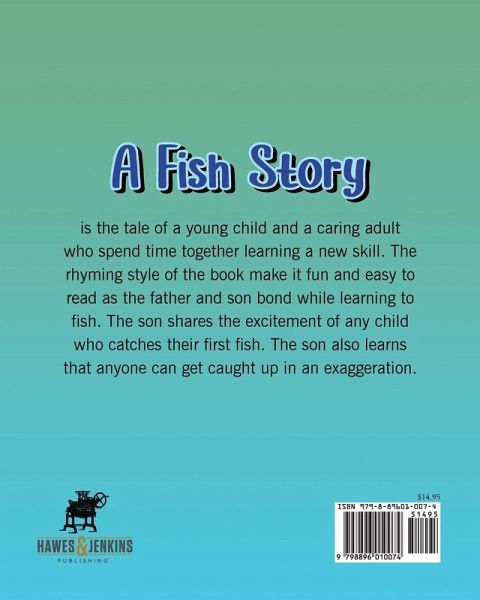 A Fish Story is the tale of a young child and a caring adult who spend time together learning a new skill. The rhyming style of the book make it fun and easy to read as the father and son bond while learning to fish. The son shares the excitement of any child who catches their first fish. The son also learns that anyone can get caught up in an exaggeration.